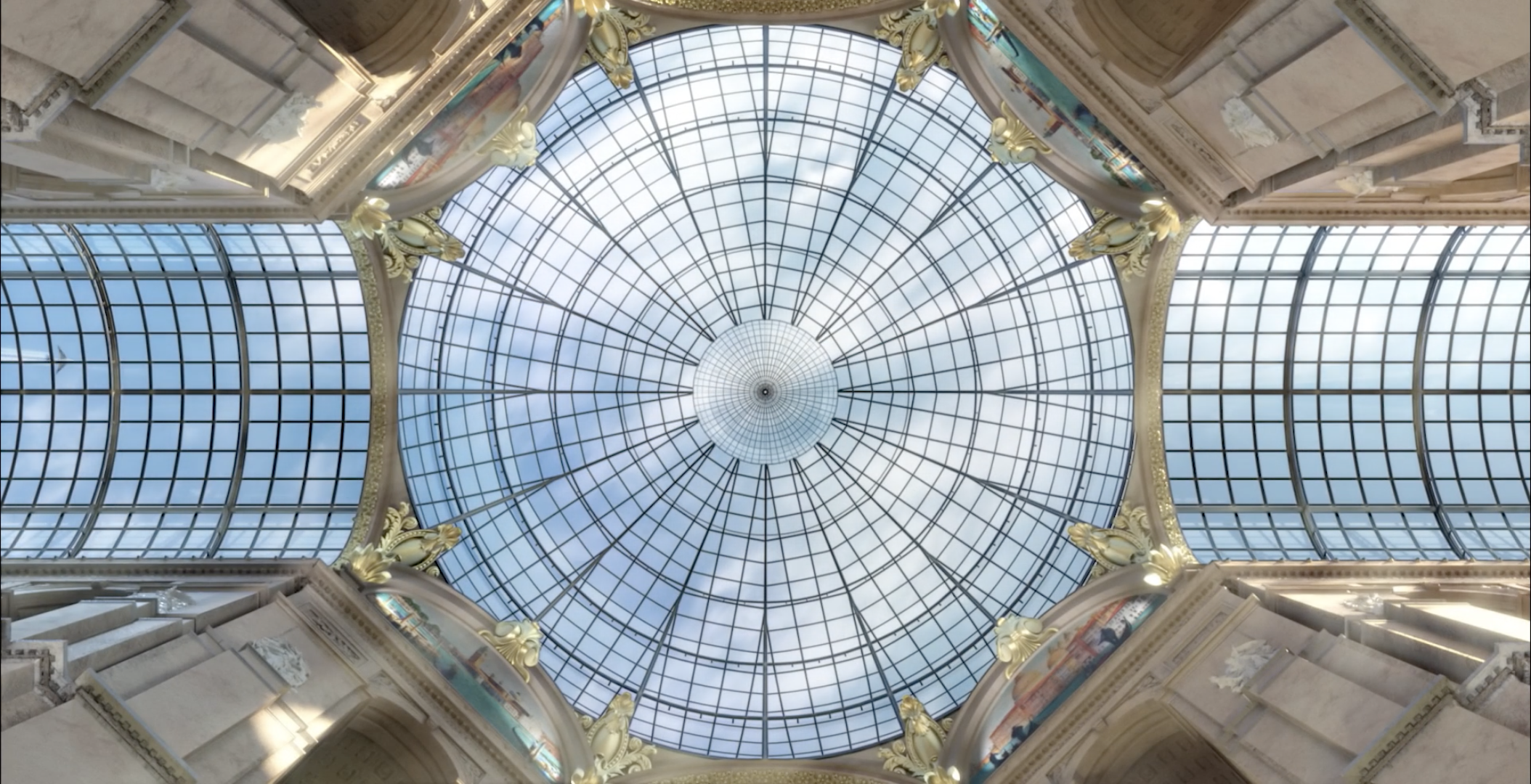 My solution was to create a grand trompe-l'œil that would morph and change every half hour. These transitions between architectural styles created a blend of structural impossibilities that celebrated architectural styles throughout the ages and from around the world. Between these larger transitions, the content would have subtle variation from sunlight mimicking the movement of the sun, to birds flying through the space. There were also weather variations and evening scenarios.
